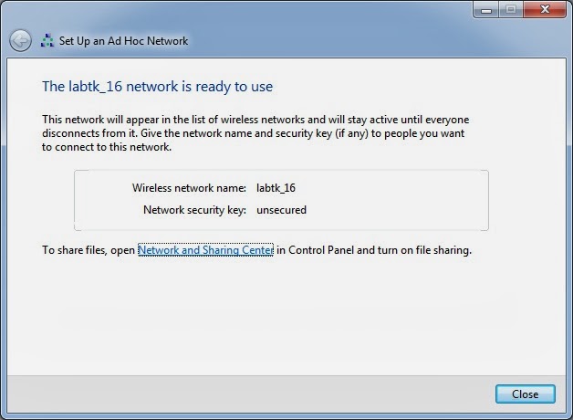 8. Tekan close untuk mengakhiri panduan pembuatan jaringan ad hoc